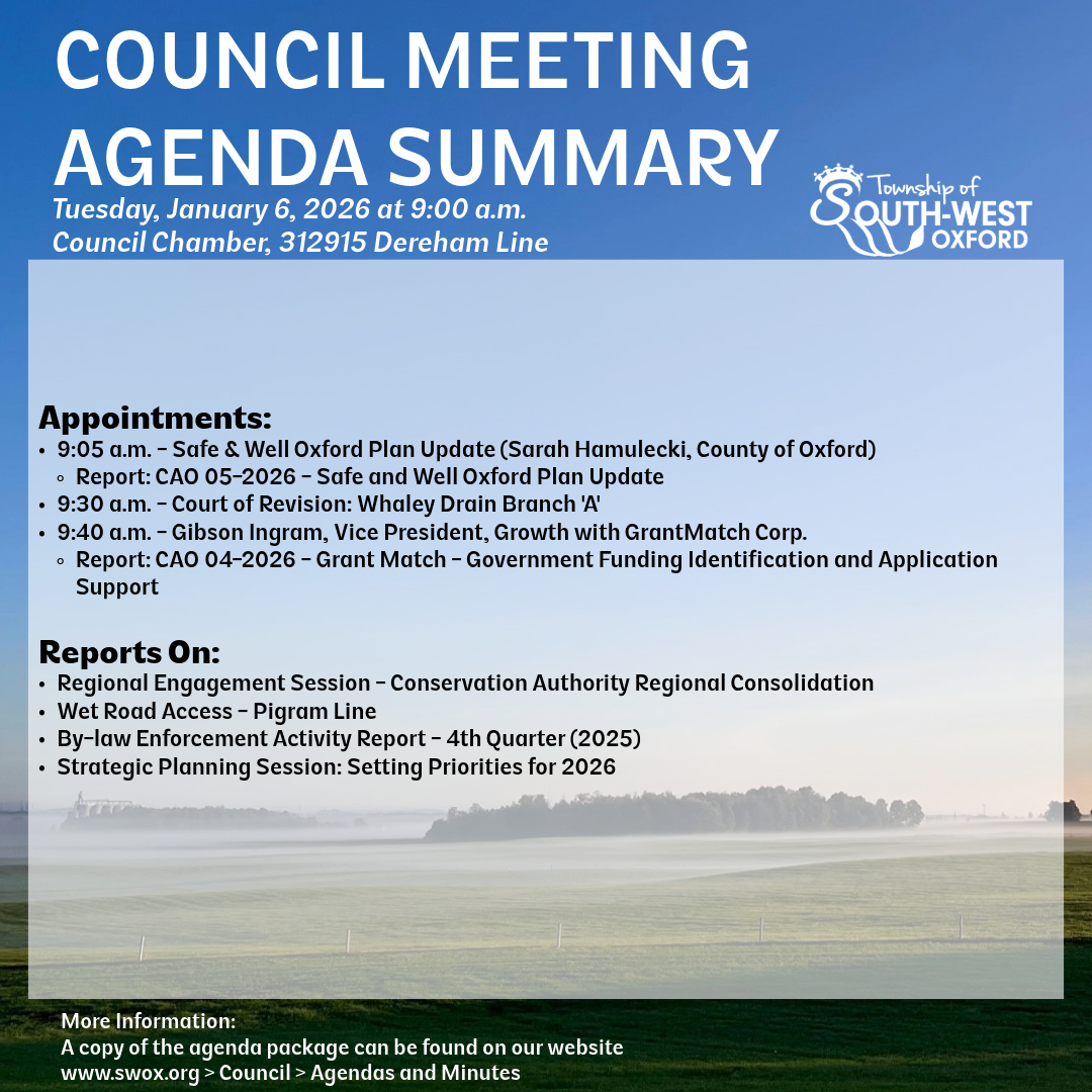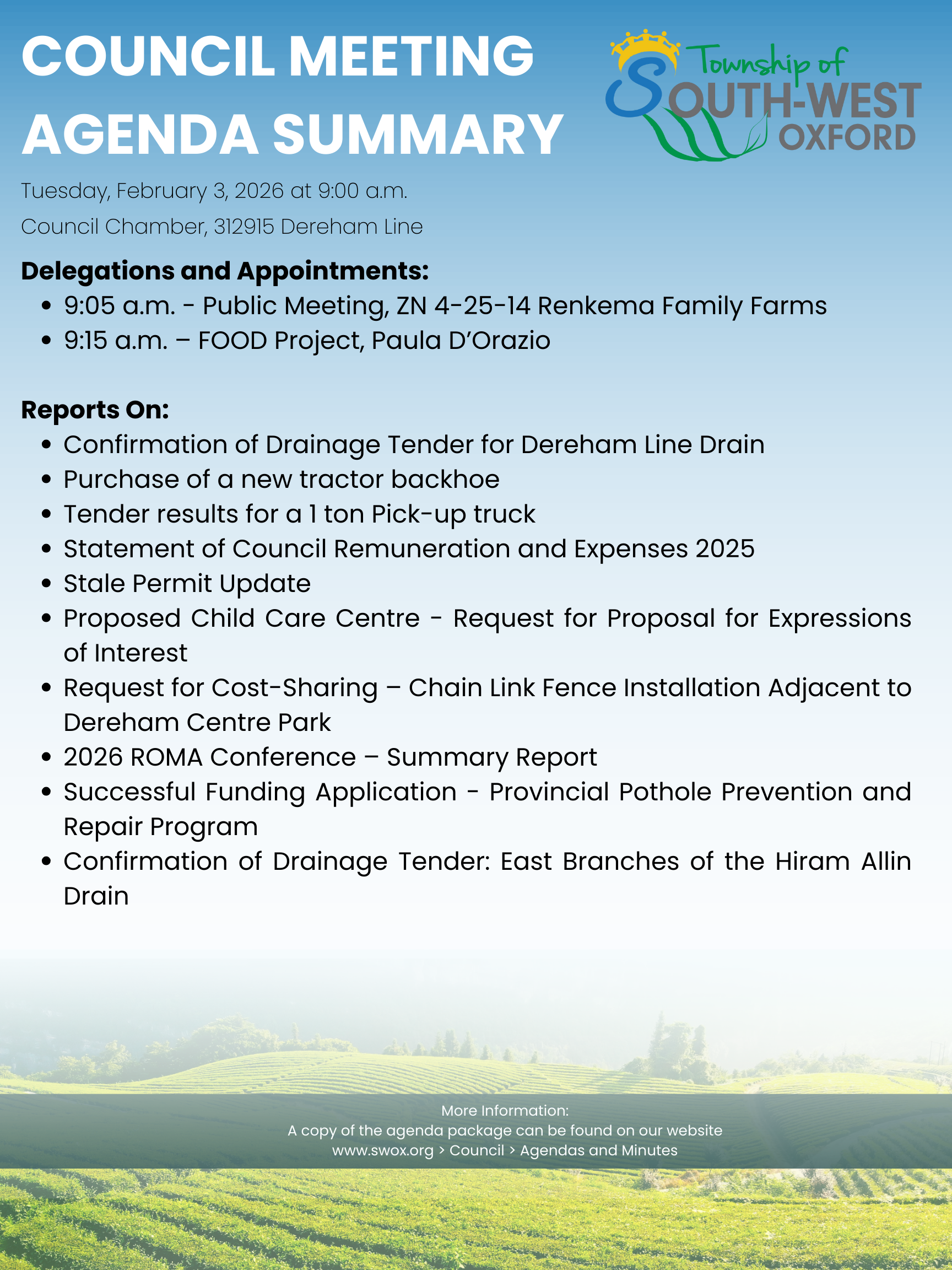 Correspondence to Council can be sent to the Township Office, 312915 Dereham Line, Mount Elgin ON, NOJ 1N0 to the attention of the Clerk or e-mailed to: dgiles@swox.org