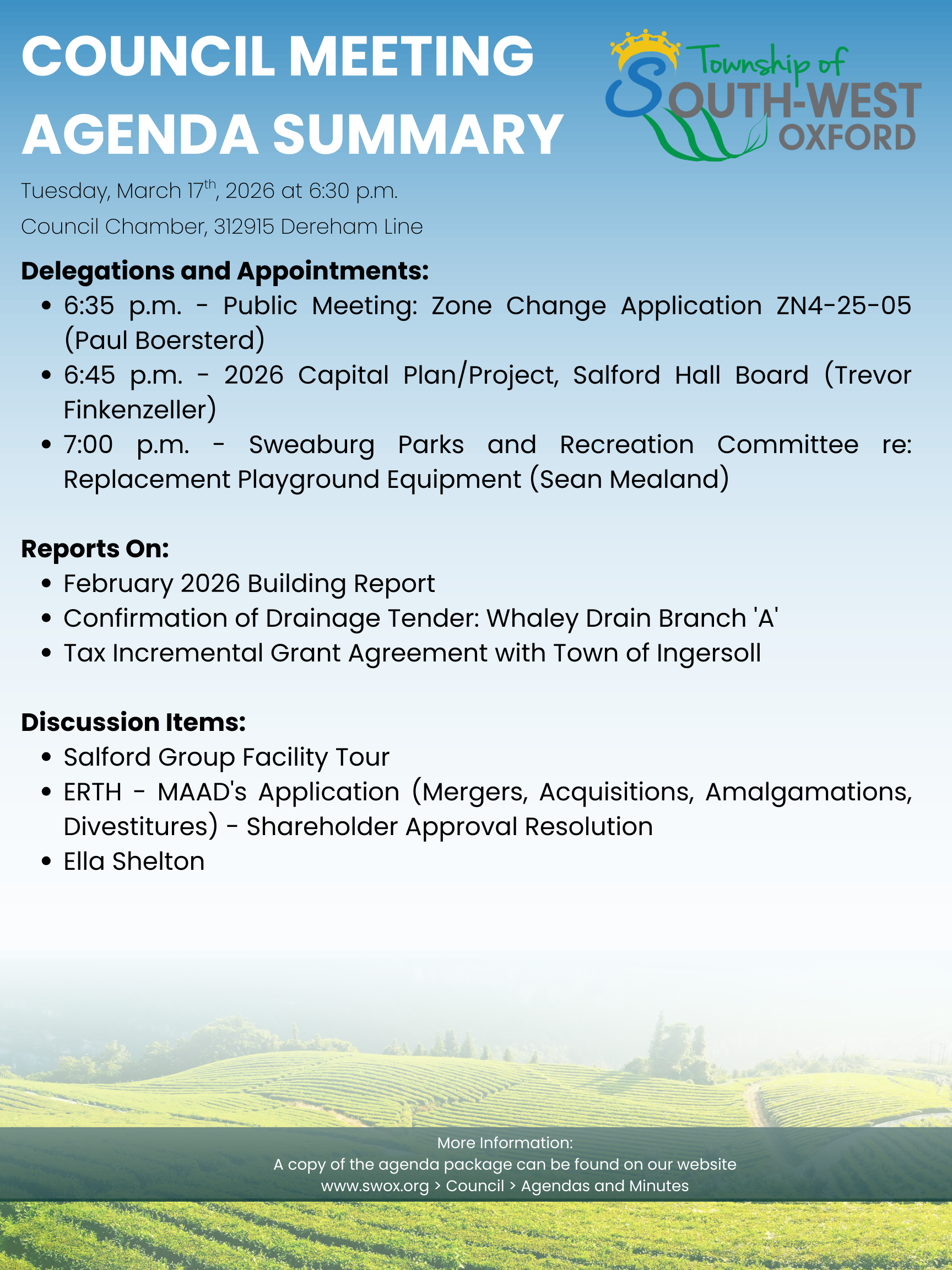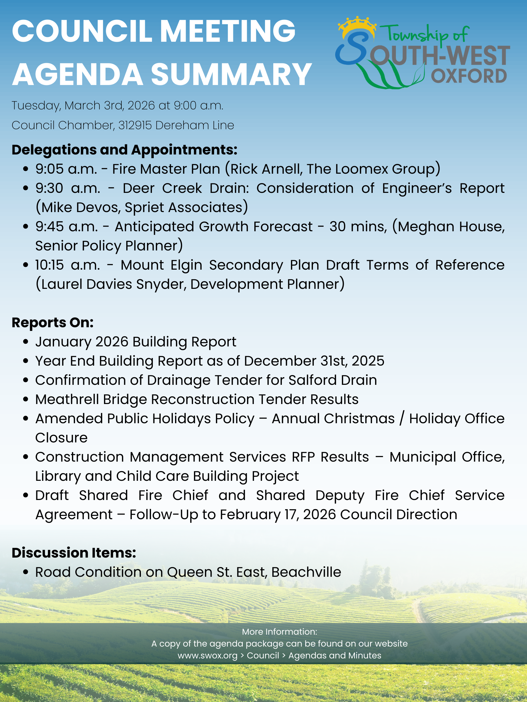 Correspondence to Council can be sent to the Township Office, 312915 Dereham Line, Mount Elgin ON, NOJ 1N0 to the attention of the Clerk or e-mailed to: dgiles@swox.org